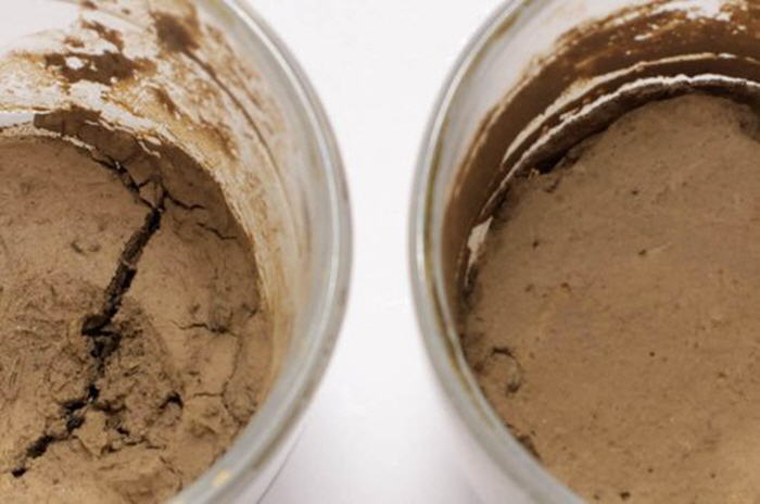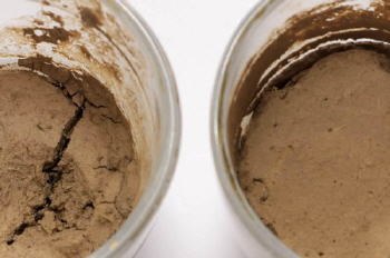 Testversuch-Nr: T113-Ackerboden links: ohne AntiTox rechts: mit AntiTox behandelt die mit AntiTox Universal behandelten Ackerböden sind sichtbar Struktur verändert! |