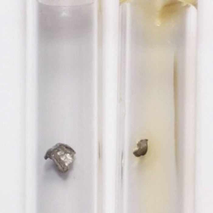 Testversuch-Nr: T213-Amalgam links: ohne AntiTox rechts: mit AntiTox behandelt mit AntiTox Universal eine sichtbare Quecksilber-Neutralisierung! |